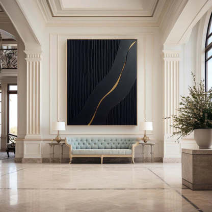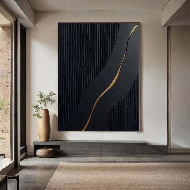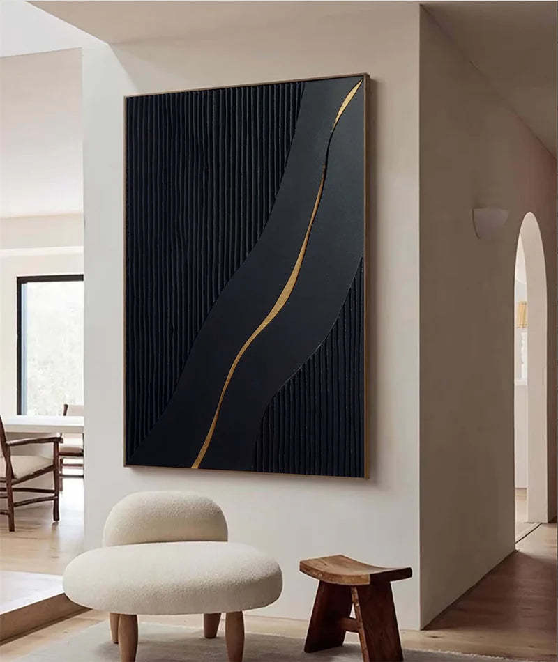 This striking abstract oil painting features a bold black textured background accented by a flowing golden line, creating a captivating visual contrast. The handcrafted design exudes elegance and modern sophistication, making it a stunning centerpiece for contemporary interiors. Ideal for living rooms, bedrooms, or office spaces, this artwork embodies the perfect blend of minimalism and luxury. The textured surface adds depth and character, while the golden accent introduces a touch of opulence. Framed to perfection, this piece is a timeless addition to any decor, offering a sense of balance and artistic refinement.