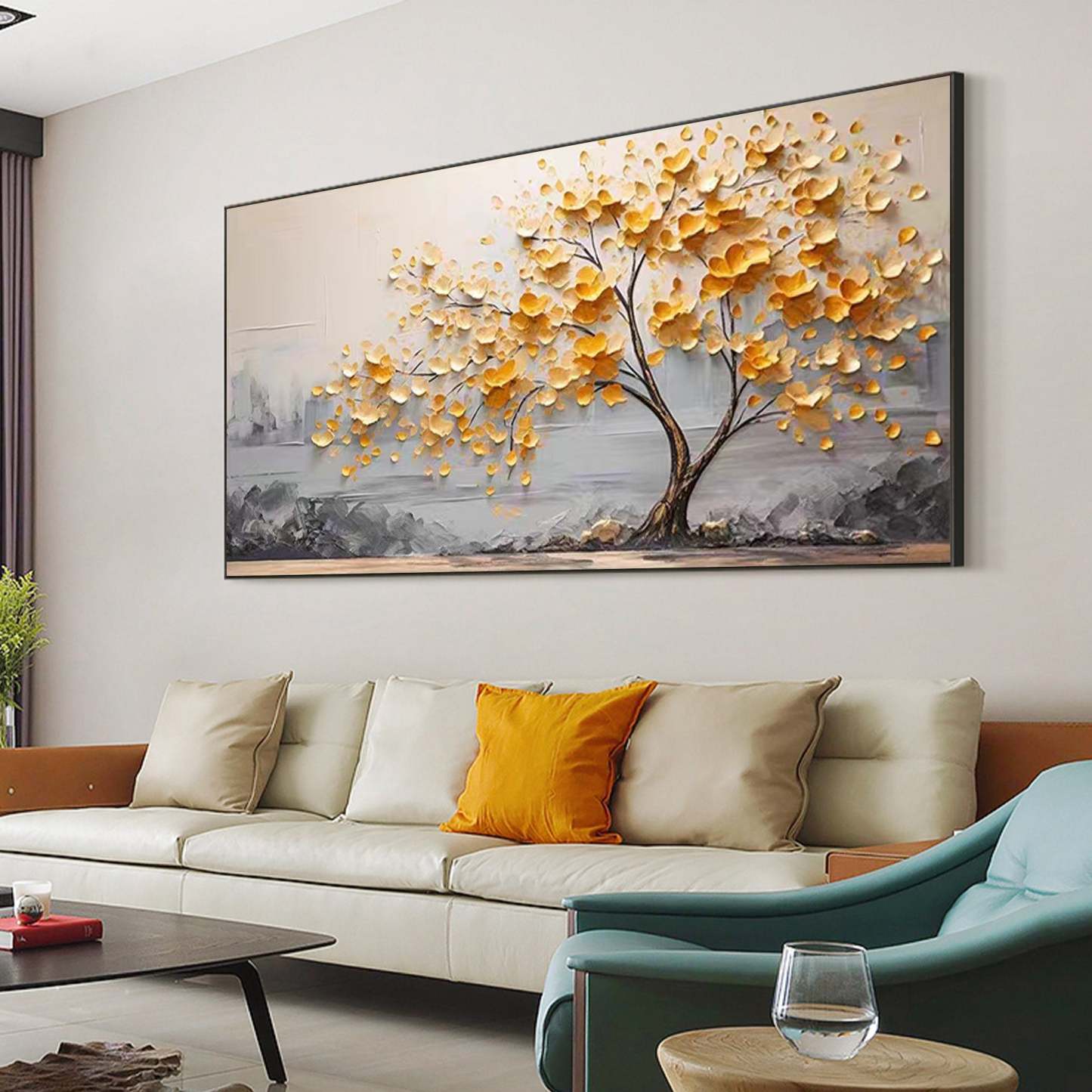 Introduce elegance and nature into your home with the "Golden Bloom Tree Painting." This textured oil painting features a majestic tree adorned with vibrant golden leaves, set against a soft gray backdrop that adds depth and sophistication. The three-dimensional details of the leaves create a captivating visual effect, making it a stunning focal point for living rooms, dining areas, or office spaces. The harmonious blend of gold and muted tones brings warmth and serenity to any modern or contemporary interior. Handcrafted to perfection, this artwork celebrates the timeless beauty of nature.